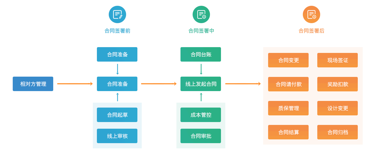- 合同周期全程數字化管理,從合同簽署前準備、合同起草、審批、結算至合同歸檔,整個過程數字化